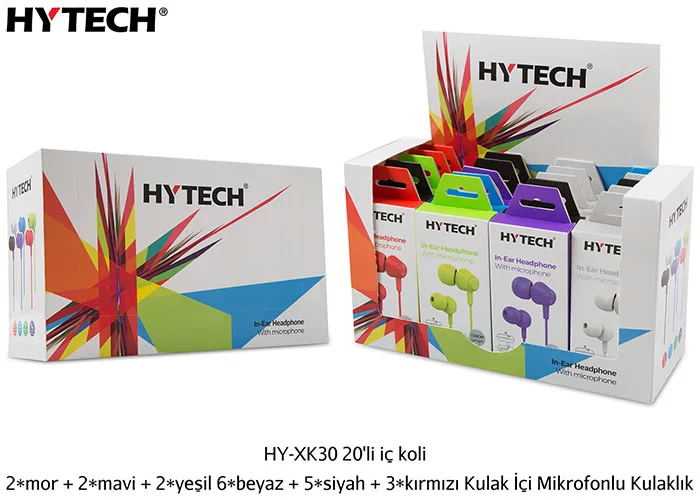 | Ürün Adı | Hytech HY-XK30 20’li iç koli + 2*mor + 2*mavi + 2*yeşil 6*beyaz + 5*siyah + 3*kırmızı Kulak İçi Mikrofonlu Kulaklık |