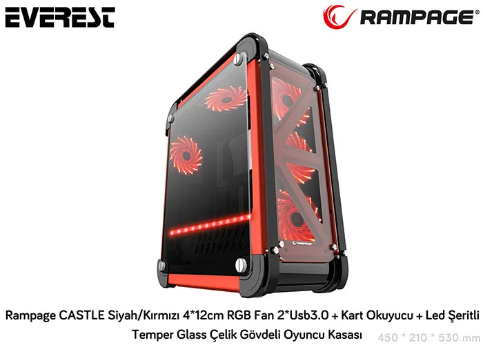 Rampage CASTLE 4x12cm RGB Fan Card Reader+Led Şerit Tempered Glass Çelik Gaming Oyuncu Kasası